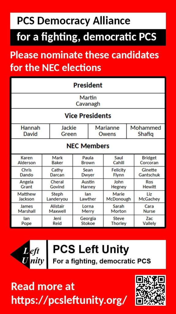 PCS Left Unity remains the leading democratic socialist organisation in the union. We call on all members who want to build a stronger, more democratic, and united union to get involved.