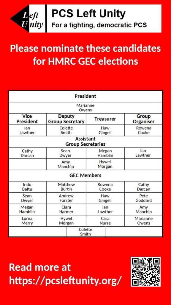 Please nominate the following Left Unity candidates for the HMRC GEC at your AGM.
