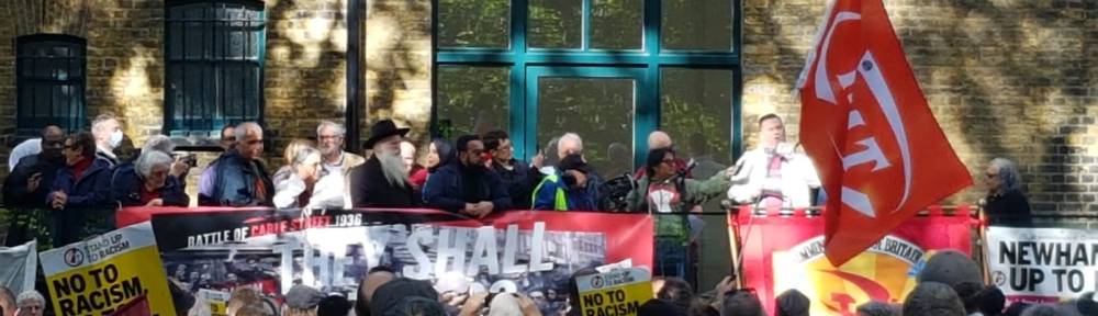 After we marched to the rally, we had a number of guest speakers including Apsana Begum MP, Jeremy Corbyn MP (Project for Peace and Justice), Rabbi Herschel Gluck, Mick Lynch (RMT General Secretary), Alex Gordon (RMT President), Massimo Ungaro MP (Italy), Amina Patel (Unison), Abdul Chowdhury (NEU), Noorahmed Uddin (Altab Ali Foundation), Joginder Bains (Indian Workers Association – GB) Julia Bard (Jewish Socialists’ Group), Rob Griffiths, (Communist Party), Weyman Bennet (Stand Up To Racism) Marlene Sidaway (International Brigades Memorial Trust), and relatives of the activists of 1936: Michael Rosen, Ruth Levitas, June Legg, and Tony Booth (Jewish Voice for Labour). All speakers made great contributions in reference to the Left which made a courageous stand against fascism, with the Jewish and Irish workers as their backbone. Today, all communities including the Bengalis, Muslims, Hindus and all faiths made a stand against the Far Right in this area!