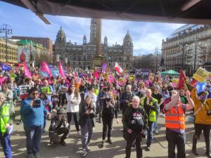 With the sun shining on us, I led the march in Glasgow alongside other speakers from trade unions, local campaign groups and MPs/MSPs. Around 2000 people marched from Kelvingrove Park to George Square where we held a rally.