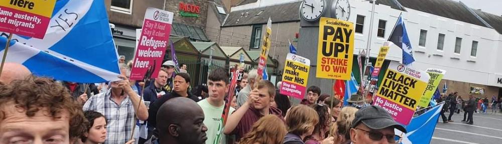 At the Protest, called by Perth Against Racism, there were speakers from Trade Unions, Human Rights Groups, Anti-Racist Groups, Independence platforms all calling for unity against the Tory Party’s anti-working class racist agenda. The word most used was probably “inhumane” in relation to the Pushback policy and Rwanda flights, but also for the many people starving now, who the foodbanks can’t support or will die this winter because of energy prices and the cost of living crisis.