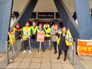 This morning saw huge picket lines outside of Peterborough, London, Newport, Belfast, Glasgow, Liverpool, Durham, and Southport offices. It was a cold start to the day, but we brought the sunshine with us, which in turn brought large numbers of members down to support the strike and the pickets were especially notable for the number of young members who were present. Morale was high with members excited about the prospect of really making a difference.