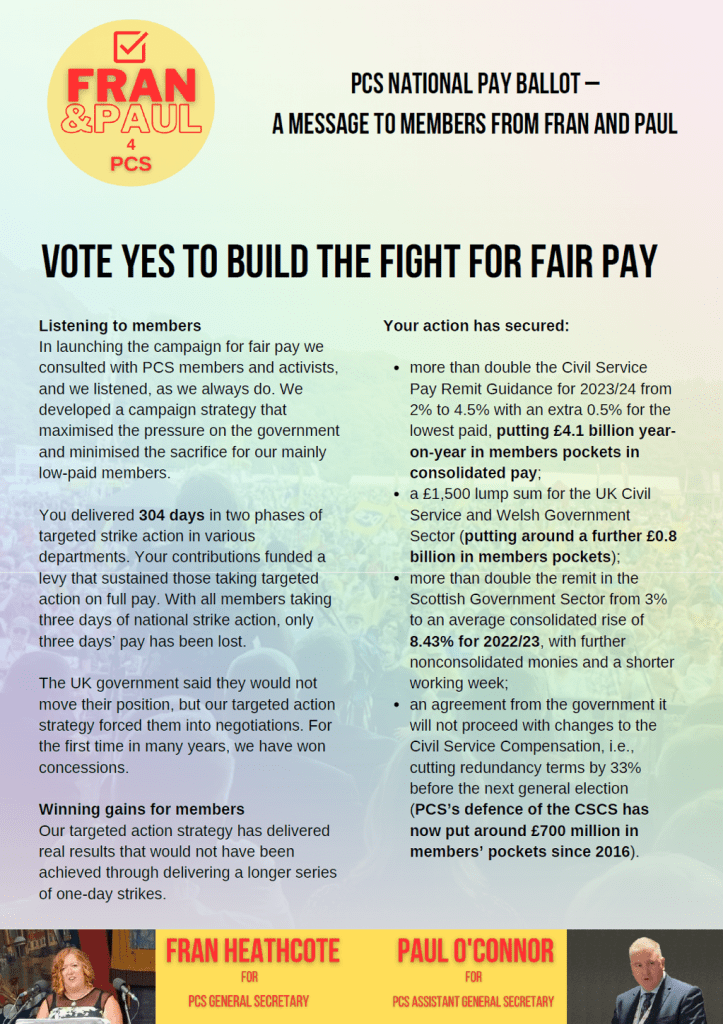 Fran Heathcote and Paul O’Connor are the Left Unity candidates in the PCS General Secretary election that starts on 4th September when the election regulations will be issued to branches. This is the most important election in PCS for over 20 years. A Left Unity victory is essential to maintain the growth and power of our union. This article explains the work done by Left Unity, gives background information about Fran and Paul and explains how you can help win the campaign.