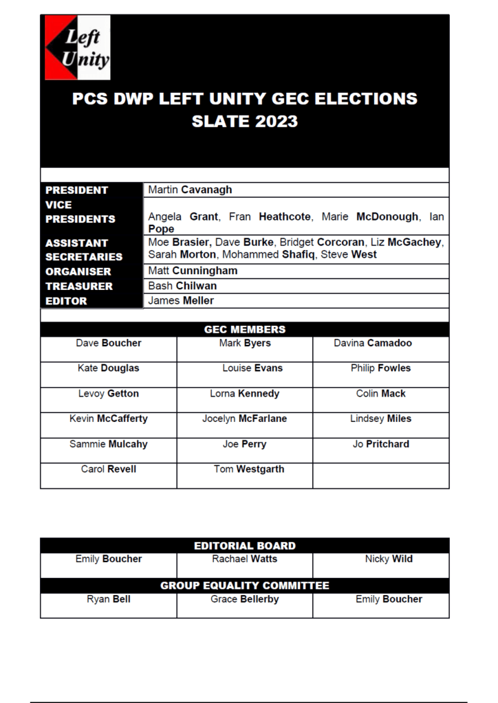 DWP GEC Candidates 2023 Share this: Click to share on X (Opens in new window) X Click to share on Facebook (Opens in new window) Facebook Click to email a link to a friend (Opens in new window) Email Like Loading...