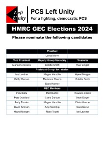 Left Unity HMRC GEC candidate statements 2024 This is the list of Left Unity candidates for the HMRC GEC 2024. Please click on the person to read their statement. Lorna Merry for HMRC President 2024 Marianne Owens for HMRC Vice President 2024 Colette Smith for HMRC Deputy Group Secretary 2024 Huw Gingell for HMRC Treasurer 2024 Ian Lawther for HMRC Assistant Group Secretary 2024 Megan Hamblin for HMRC Assistant Group Secretary 2024 Hywel Morgan for HMRC Assistant Group Secretary 2024 Cathy Darcan for HMRC Assistant Group Secretary 2024 Marianne Owens for HMRC Assistant Group Secretary 2024 Colette Smith for HMRC Assistant Group Secretary 2024 Clara Harmer for HMRC Assistant Group Secretary 2024 Indu Battu for HMRC GEC 2024 Matt Burton for HMRC GEC 2024 Rowena Cooke for HMRC GEC 2024 Pete Goddard for HMRC GEC 2024 Cathy Darcan for HMRC GEC 2024 Sean Dwyer for HMRC GEC 2024 Andy Forster for HMRC GEC 2024 Megan Hamblin for HMRC GEC 2024 Claire Keenan for HMRC GEC 2024 Clara Harmer for HMRC GEC 2024 Amy Manchip for HMRC GEC 2024 Cara Nurse for HMRC GEC 2024 Hywel Morgan for HMRC GEC 2024 Rose Touati for HMRC GEC 2024 Ian Lawther for HMRC GEC 2024 Share this: Click to share on X (Opens in new window) X Click to share on Facebook (Opens in new window) Facebook Click to email a link to a friend (Opens in new window) Email Like Loading...